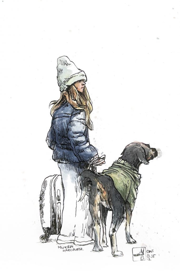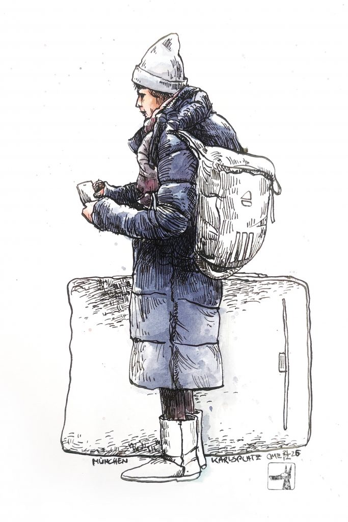 München, Hauptbahnhof, Skizzen mit Feder und Aquarell